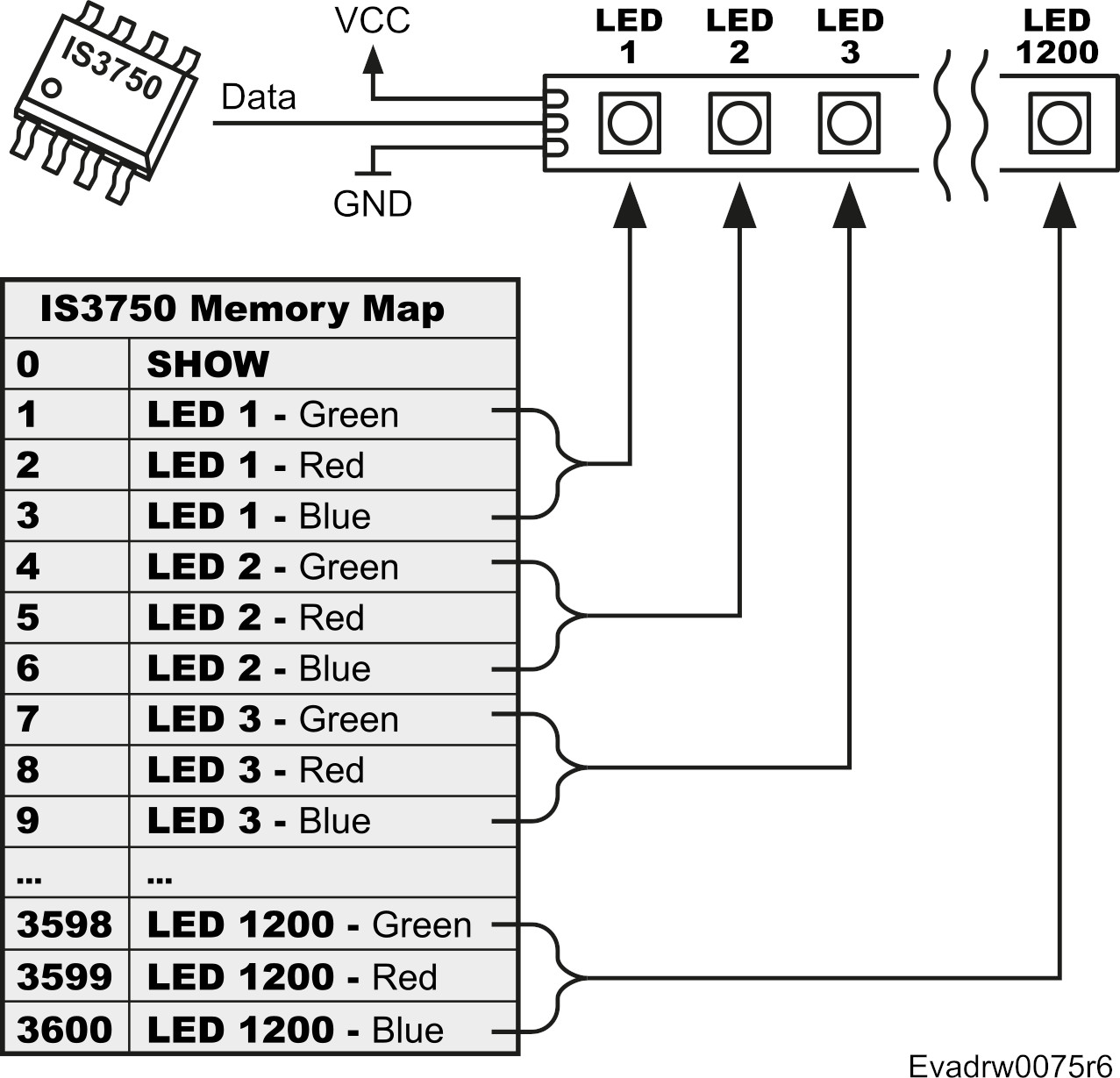 All the LEDx registers are sent consecutively from address 1 to address 3600 via the LED pin, encoded in NZR Addressable LED protocol.